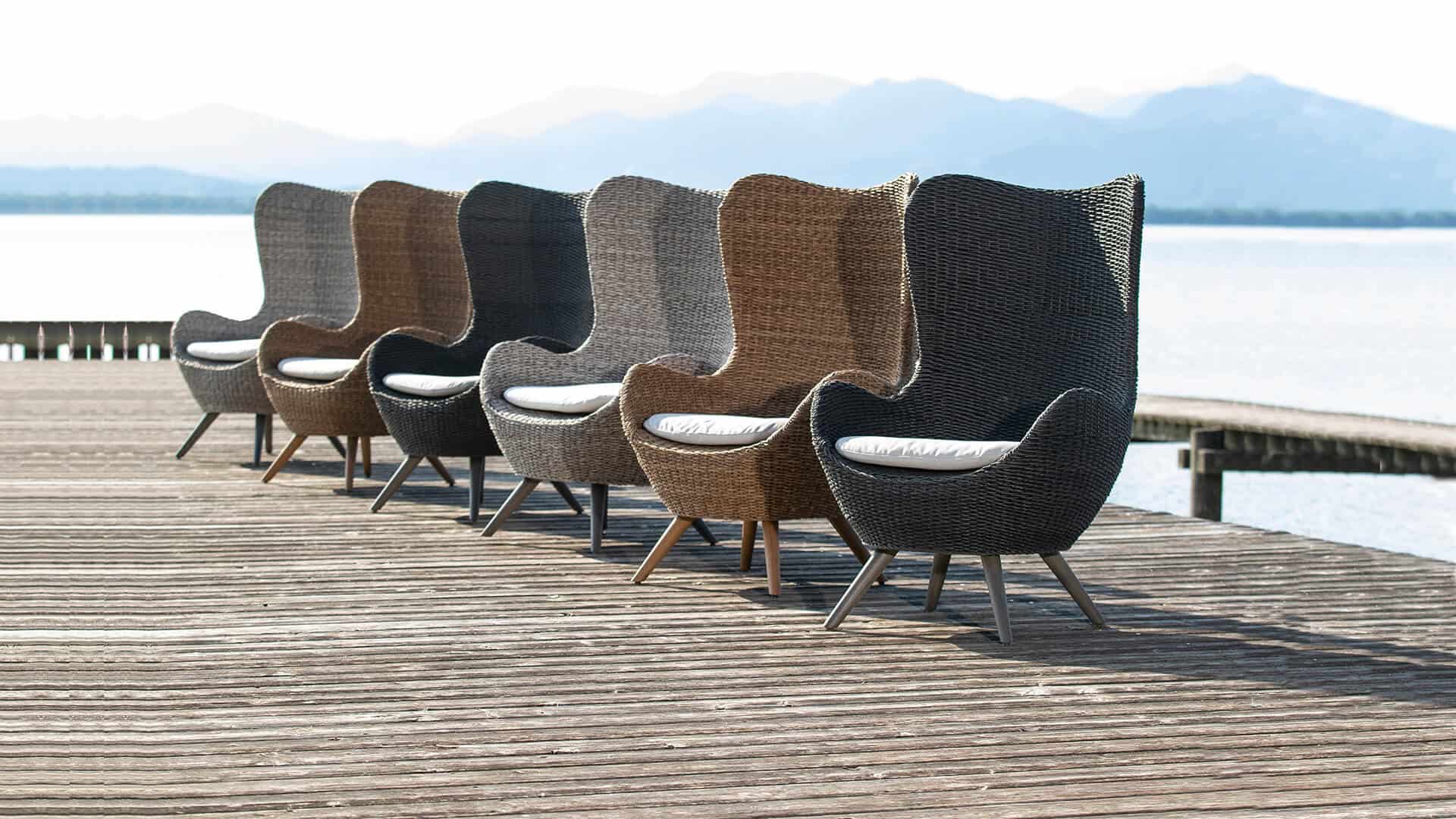 Der Sessel Ocean wirkt auf die allermeisten schon von weitem magisch. Ein sofortiges „hineinsetzen wollen“ ist die übliche Reaktion. Durch die umhüllende Form stellt sich schnell ein intimes, schützendes Gefühl ein und verleitet zum Abschalten und Träumen. Schwelgen Sie in einem Ozean von Träumen und guten Gefühlen. Mirotex und FUREMA (Furniture Resysta Material) machen den Ocean (mit oder ohne Fußhocker, den man übrigens auch als Beistelltisch nutzen kann) absolut witterungsbeständig.