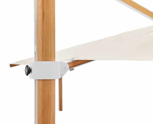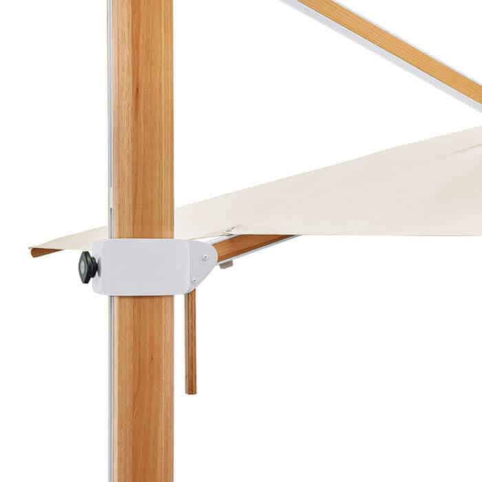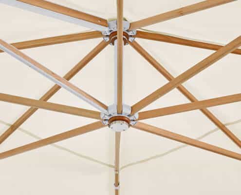 Mast aus hochwertig lackiertem Eukalyptusholz mit zusätzlich stabilisierendem Aluminiumkern, 360° drehbar. Streben aus Eukalyptusholz. Edelstahl- und Aluminiumkomponenten silber pulverbeschichtet. Holz ist ein Naturprodukt und kann sich mit der Zeit verfärben.